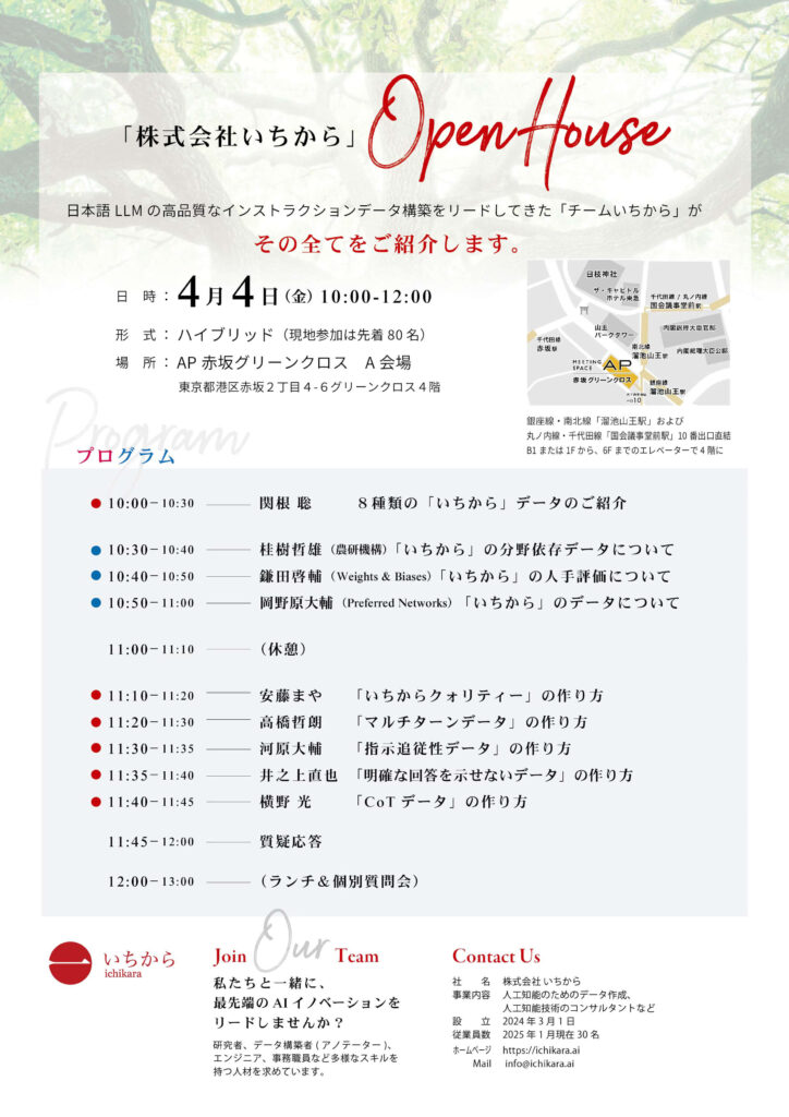 2025年4月4日、株式会社いちからはAIコンサルティング・データ開発事業のお披露目として「Open House」 を開催いたしました。